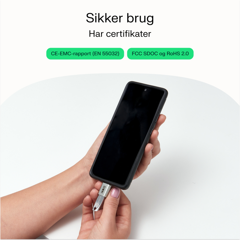 Adapterne designes i Danmark af Greencell og opfylder strenge sikkerhedsstandarder. De har CE-EMC Report (EN 55032), FCC SDOC og RoHS 2.0 certificeringer, der bekræfter deres kvalitet og overholdelse af standarder.