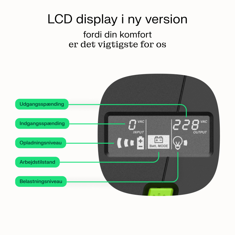 UPS'en har et LCD-display, der informerer om mange vigtige arbejdesparametre samt en dedikeret applikation, der gør det lettere at bruge og kontrollere enheden. I den nye version har vi forbedret og reduceret lysstyrken på skærmen, så den er så læselig og komfortabel som muligt for brugeren.